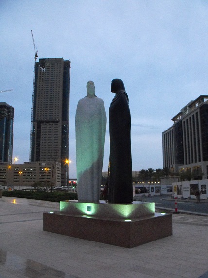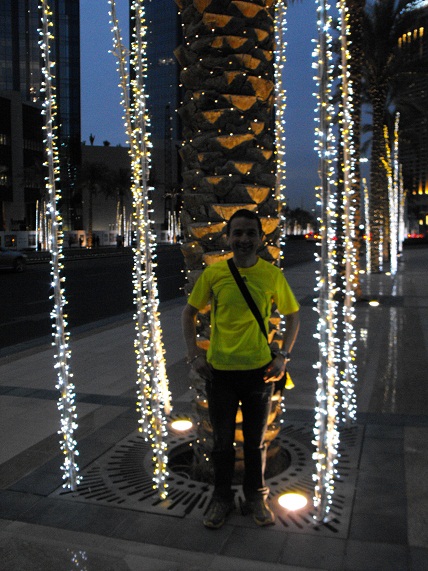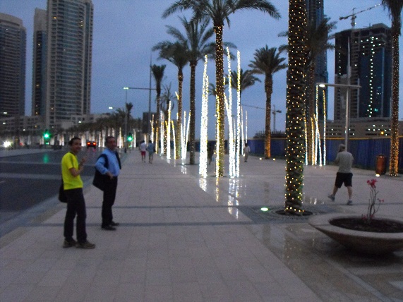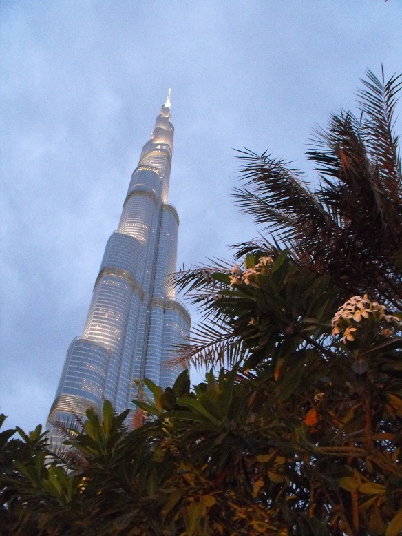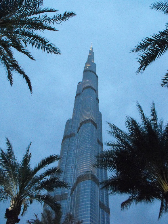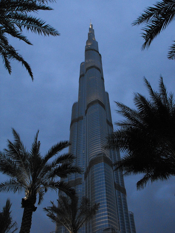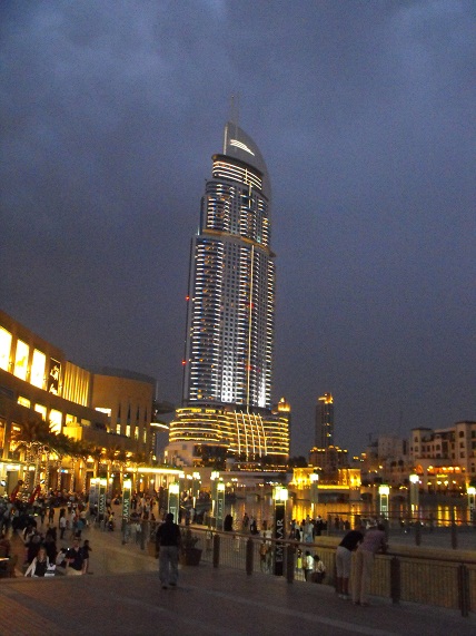 La nostra prima visita al Burj Khalifa avviene di sera: la temperatura si mantiene sui 28°C ma il cielo è nuvoloso, il che è alquanto insolito per Dubai. Comunque le nubi rendono l'atmosfera suggestiva, così come il gioco di luci e ombre che ogni tramonto sa offrire. Per stasera ci limitiamo a guardare dal basso l'imponente grattacielo che, con i suoi 828 metri, è il più alto del mondo. |