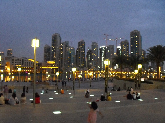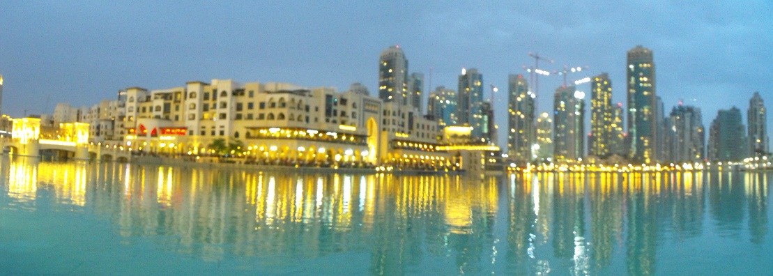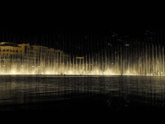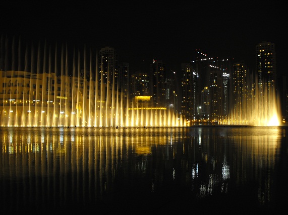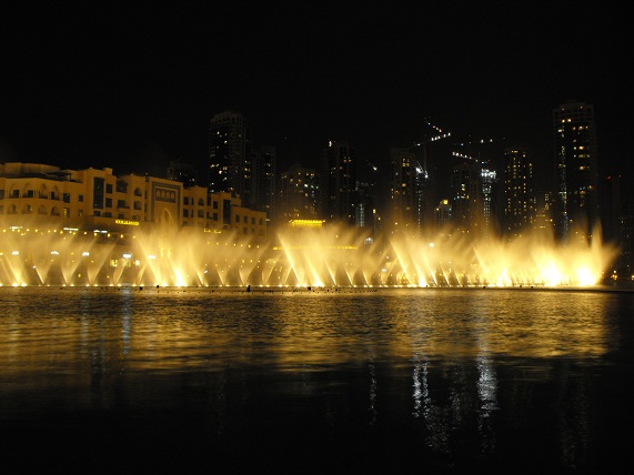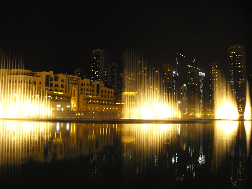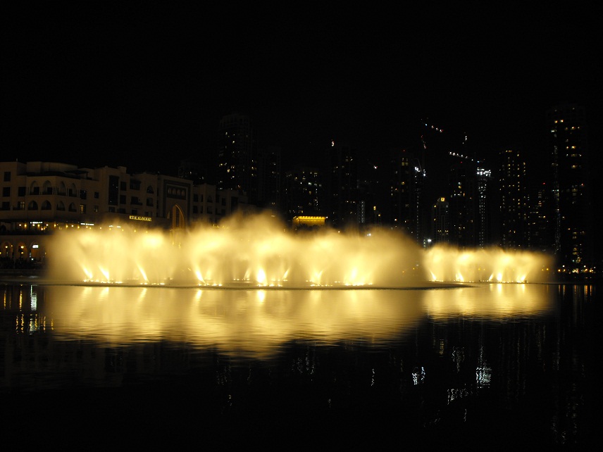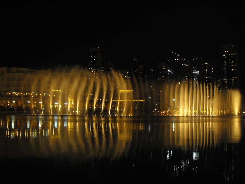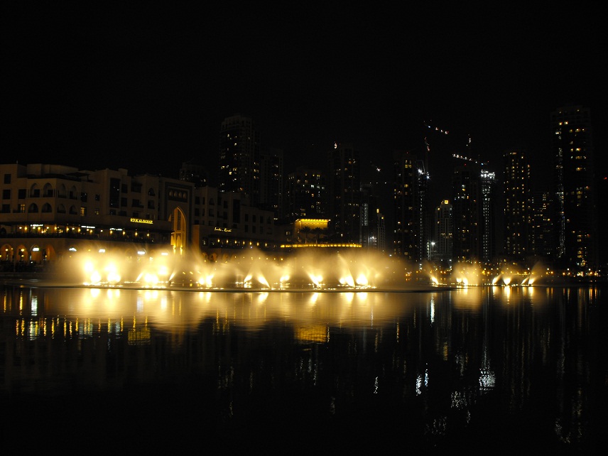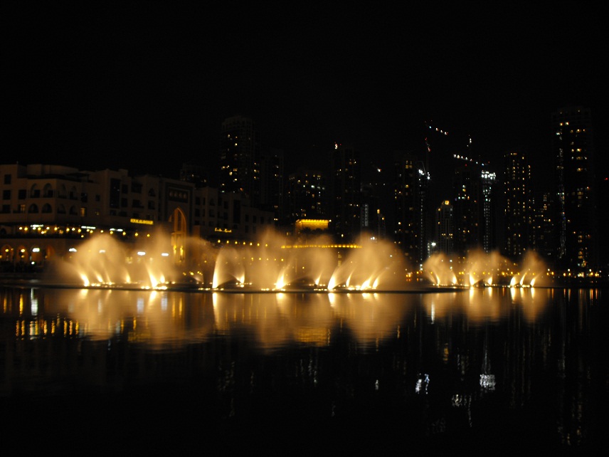Le fontane danzanti alla base del Burj Khalifa: il primo spettacolo da noi visto si è svolto col sottofondo musicale della canzone «The Prayer», di Andrea Bocelli e Céline Dion. |