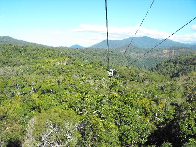 La discesa verso la costa non avviene col trenino storico ma con la funivia. Si tratta della Skyrail Rainforest Cableway che è una delle più lunghe del mondo. I cavi della teleferica sono sospesi tra ben 33 piloni, molto distanziati gli uni dagli altri, e si raggiunge un'altezza vertiginosa. |