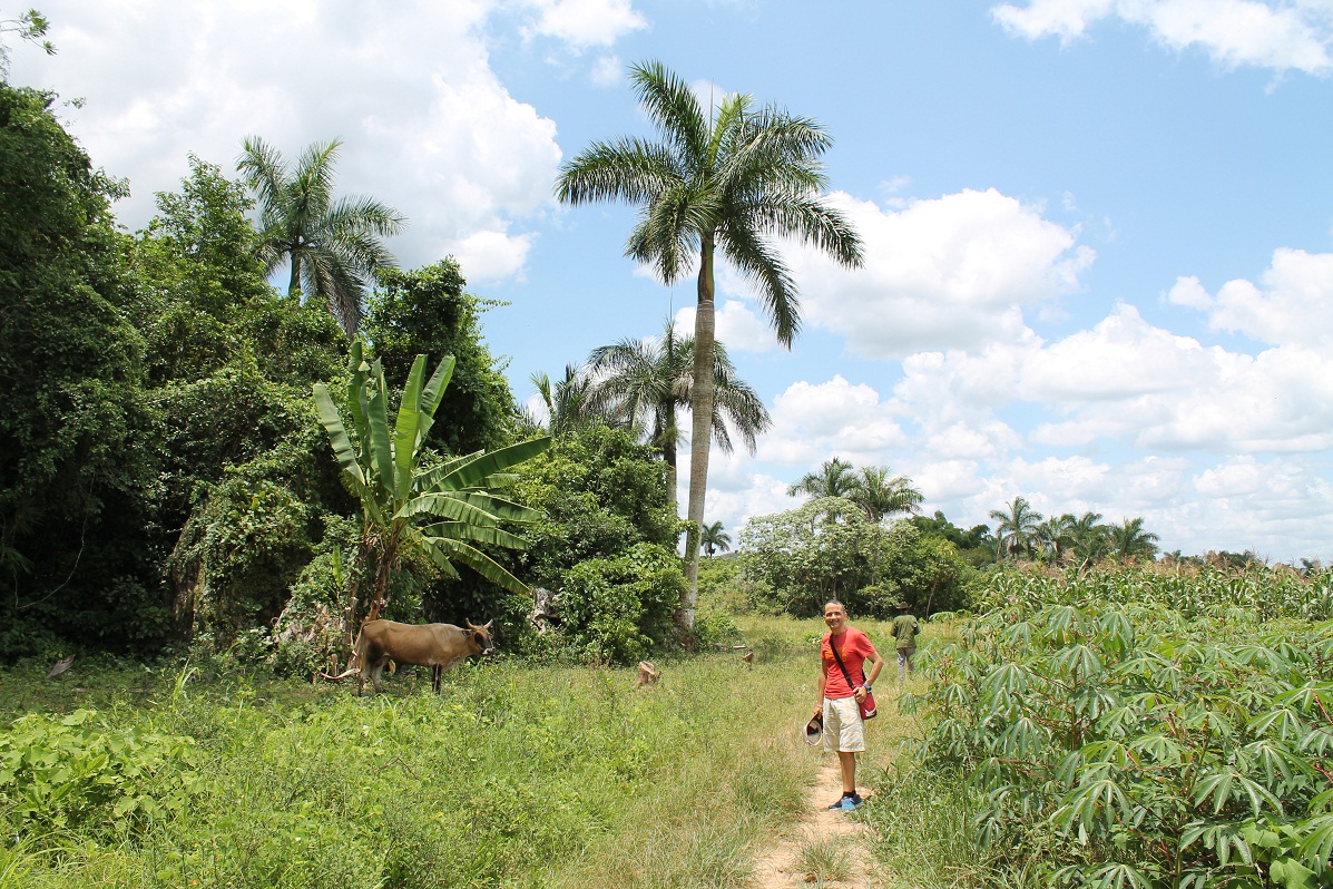 Attraverso piantagioni di tabacco, canna da zucchero e mais, percorriamo la parte orientale della Valle di Viñales e giungiamo nei pressi di un mogote. La nostra guida ci invita a scendere da cavallo, cosa che noi effettuiamo con la leggiadria e la dimestichezza che manco John Wayne in "Ombre Rosse" ha mai evidenziato! |