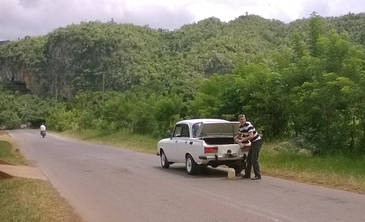 Siamo a circa 4 km da Viñales, ove c'è l'unico rifornimento della zona: la giornata è bella e non sarebbe la fine del mondo tornare a casa a piedi, ma non vedere la "Cueva del Indio" sarebbe un peccato. L'autista, quindi, estrae una bottiglia di plastica dal cofano e dice che tornerà entro 15 minuti. Io so bene che non potrà riuscirci e glielo faccio notare col cipiglio (che mi riesce benissimo) di chi è arrabbiato, volendo far accentuare il suo senso di colpa. Il tizio giura che ce la farà e va via prendendo al volo la macchina di un conoscente che passava di lì per caso, il che rende il tutto molto Pechino-Express-style. |
