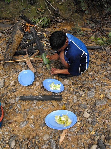 ... quindi raccoglie della legna secca e accende un fuoco... Be', ha usato un accendino e non i legnetti da sfregare come nell'età della pietra, ma fa niente: non siamo all'Isola dei Famosi, quindi l'importante è che ora ci sia un bel focherello scoppiettante sul quale Lohai adagia le pentole di bambù in alcune delle quali, oltre al riso, ha introdotto delle erbe raccolte nella foresta e del pollo affinchè il tutto sia stufato. |