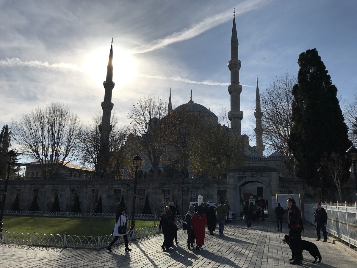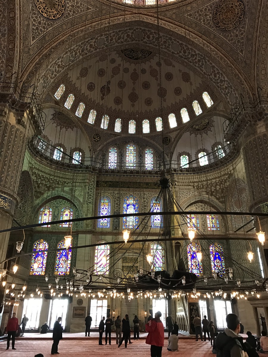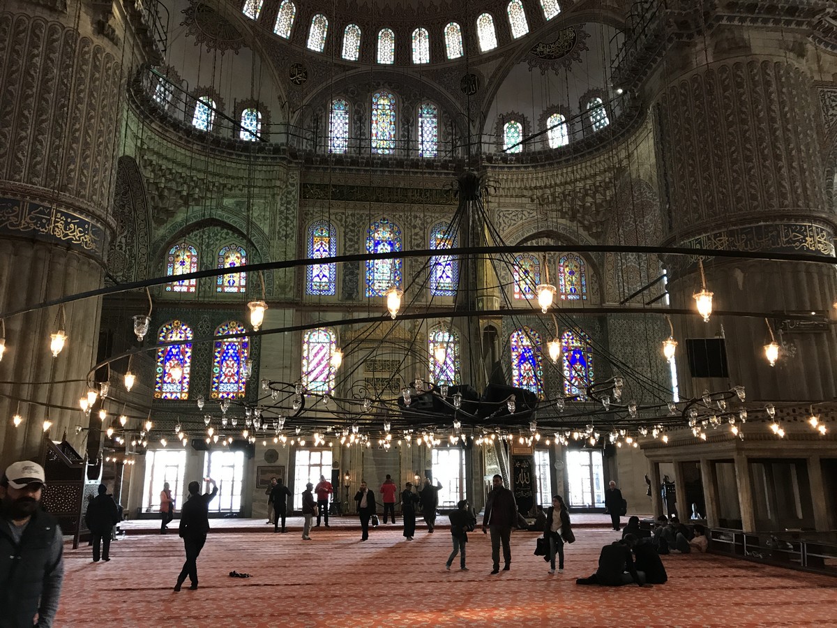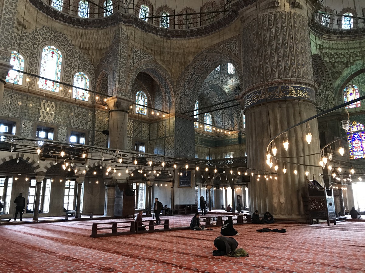 In un modo o nell'altro riusciamo a tornare nel quartiere di Sultanahmet per visitare la Moschea Blu, la quale deve il suo nome alle 21.043 piastrelle di ceramica turchese inserite nelle pareti e nella cupola. È infatti il turchese il colore dominante nel tempio: pareti, colonne e archi sono ricoperti dalle maioliche di İznik (l'antica Nicea), decorato in toni che vanno dal blu al verde.