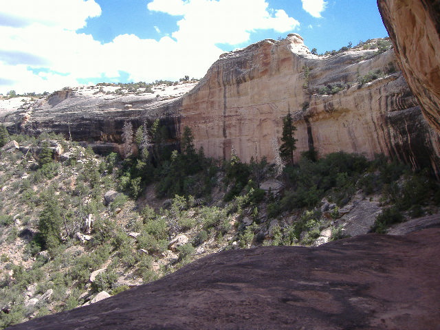Reminiscenze manzoniane a parte, tutta l'area è uno dei posti più belli dell'intero viaggio - almeno per me. Il parco è molto più verde della media, e poichè pochi lo conoscono, mi fa sentire orgoglioso per averlo scoperto! In fondo alla stretta gola scorre un affluente del Colorado. Il sentiero è ricavato lungo una sporgenza rocciosa che a tratti è molto esigua. La parete sopra di noi in alcuni punti tende a sovrastarci, quasi a formare un tetto: ci si sente veramente "in casetta", e questa sensazione dovettero averla pure gli indiani Anasazi, che qui piazzarono uno dei loro insediamenti.