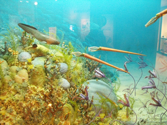 ![]() Non sono le vasche di un acquario ma la riproduzione di un ambiente sottomarino del periodo "siluriano" (poco più di 400 milioni di anni fa). |