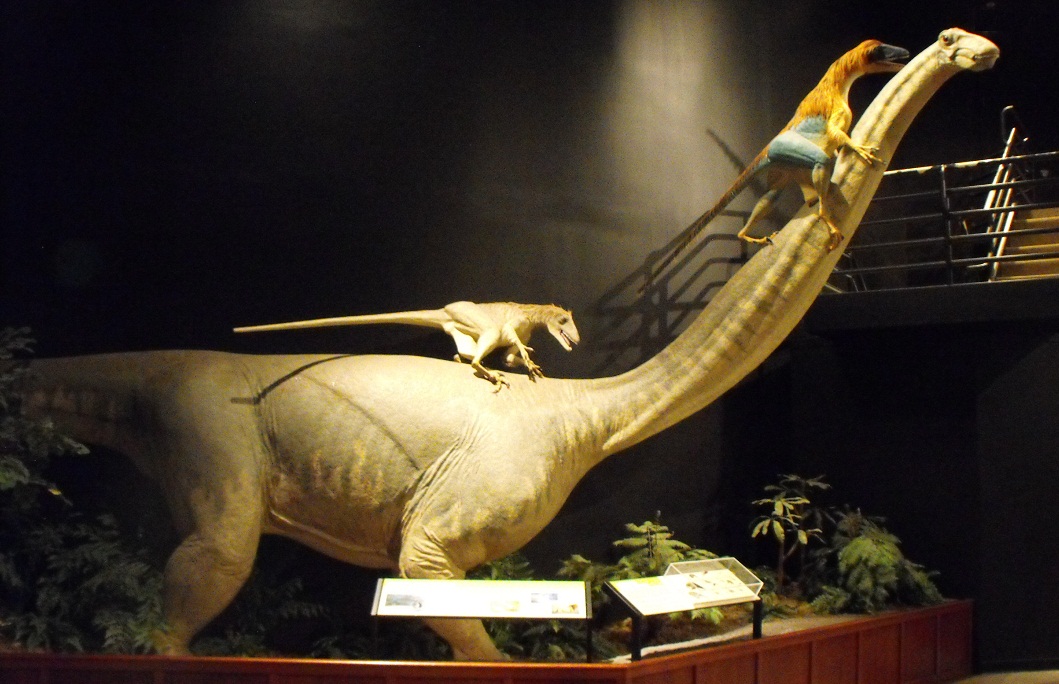 La ricostruzione dell'attacco di due velociraptor a un brontosauro. I due aggressori sono un maschio e una femmina, raffigurati con i probabili colori che sono stati immaginati basandosi sul dimorfismo sessuale dei rettili attualmente viventi. |